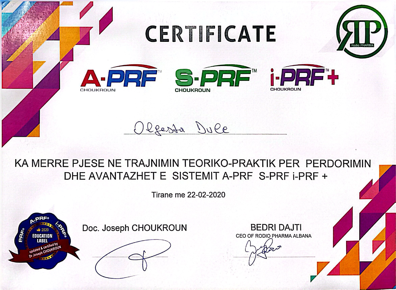Olgesta Dule graduated in Dentistry with a Master’s degree in Prosthetics in 2013. After many years of experience in dentistry, she brings you Radiant Dental Clinic, dedicated to improving patients’ oral health and smiles with care and a high level of professionalism. She is also trained in the use and benefits of the A-PRF, S-PRF, and i-PRF systems, and is excited to begin her next professional journey with a Master’s degree in Advanced Orthodontics 🔜